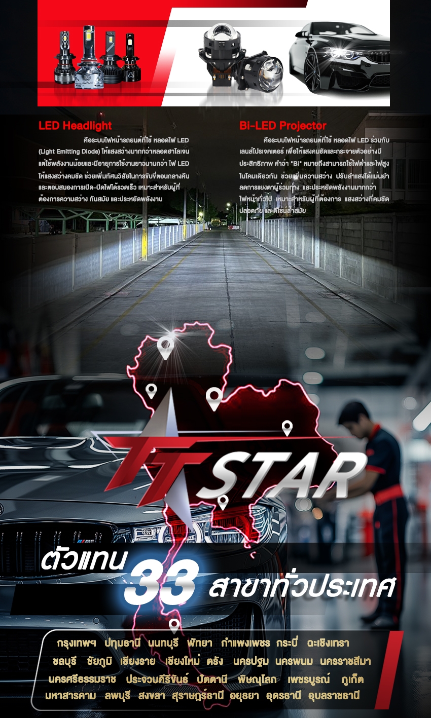 "Tt Star Thailand" เพื่อเป็นศูนย์บริการด้านไฟหน้ารถยนต์มืออาชีพทั่วประเทศ ซึ่งเสนอผลิตภัณฑ์ไฟหน้าที่มีประสิทธิภาพการส่องสว่างสูงสุด จากแบรนด์ไฟหน้าชั้นนำระดับโลกพร้อมบริการติดตั้ง อัพเกรดที่เป็นมาตรฐานสากลที่ Tt Star Thailand เรามุ่งมั่นให้แน่ใจว่าการขับขี่ของคุณปลอดภัยสูงสุดด้วยแสงสว่างที่คุณไว้วางใจได้"